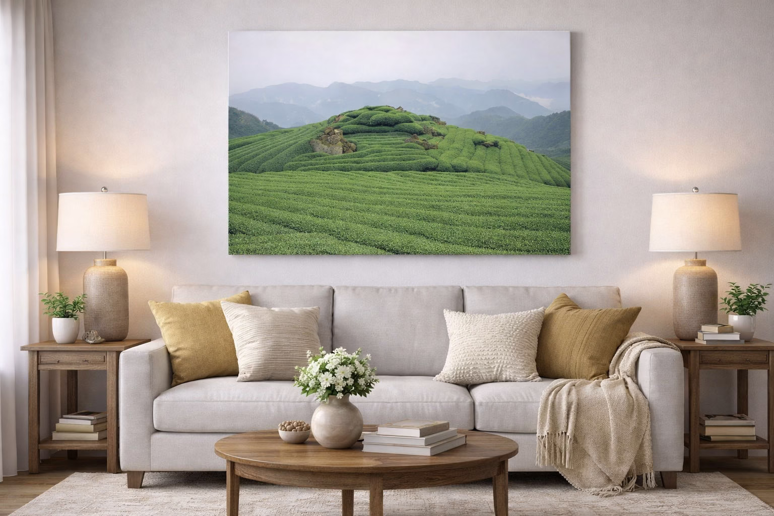 一座翠綠的茶山,背景有千重山與藍天,整體景色優美。